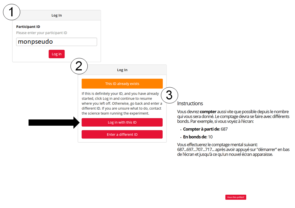 - Vous vous loggez sur le site avec votre Participant ID (ici pour example “monpseudo”)